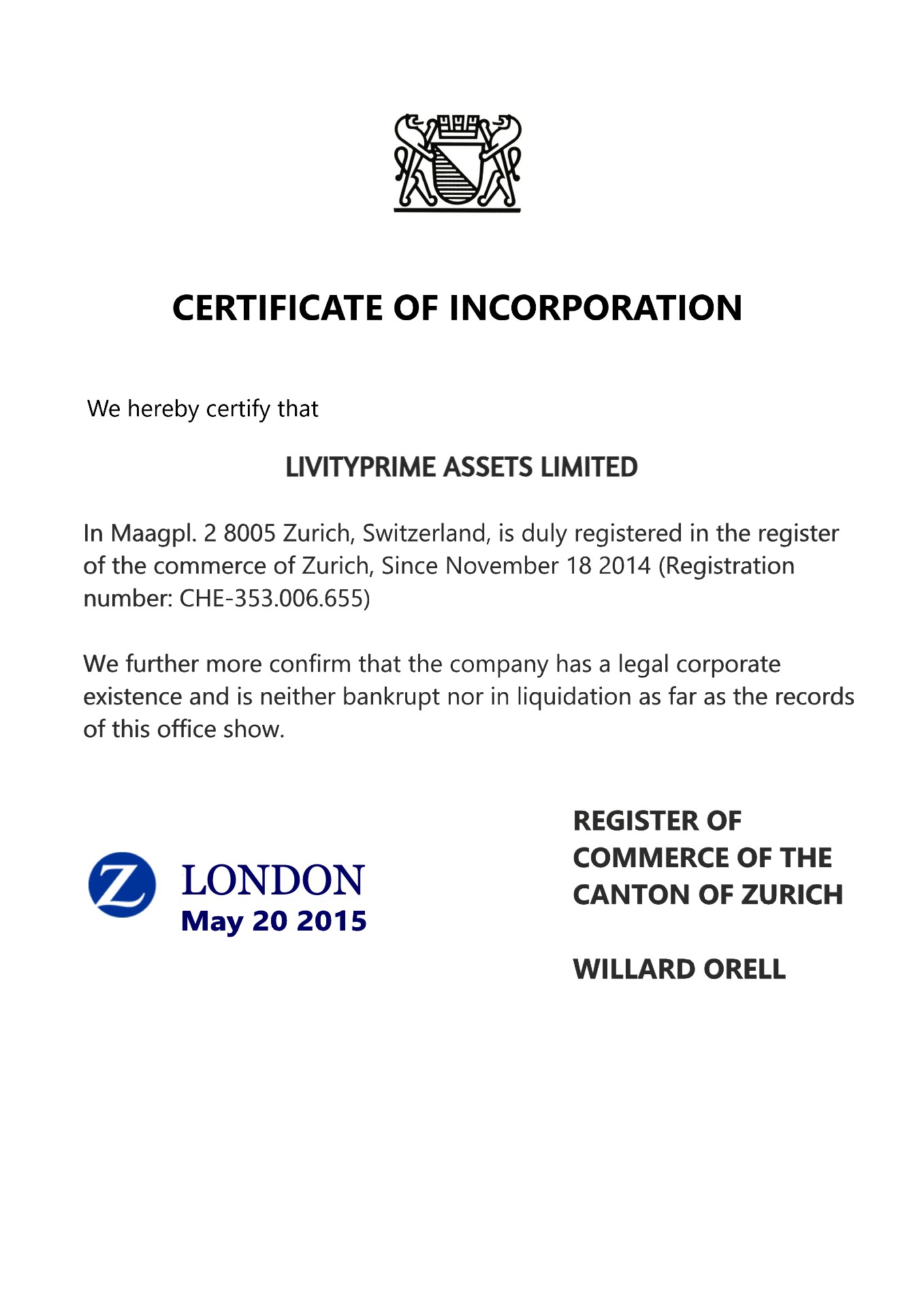 Livityprime limited is a legal Corporate body whose goals is to elevate the financial status of their clients. we are recognized by the swiss commerce of the canton of zurich and duly registered as a reliable finance company. Below is our certificate of Incorporation.